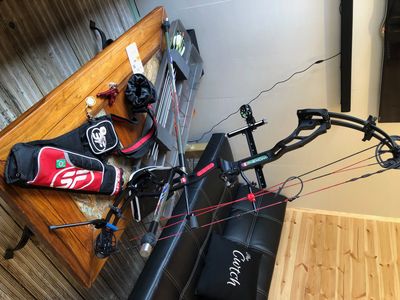 Wh PSE Phenom SD RH compound bow with complete set up. Includes 8 Easton Platinum 1616 Arrows, Carter Big Kid release aid target 4, Ultima CPX compound STD 520 9” RH, Avalon bag red, Gas pro revolver stand, lil freak show RH launcher, Easton Delux pouch, Sebastian Flute quiver, infitec iris 300 scope, long rod offset, TEC300 infatec long and short rod and Easton delux arrow case.